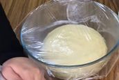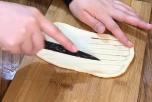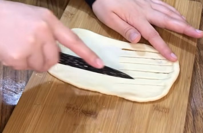 Jakmile je těsto dostatečně vykynuté, postupně jej rozdělte na několik menších bochánků. Válečkem každý bochánek rozválejte a jednu jeho polovinu nakrájejte nožem na proužky. Poté jej přeložte na polovinu, vložte do něj náplň s jednou rozinkou a zabalte těsto do sebe. Postup opakujte se všemi částmi těsta.