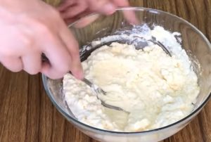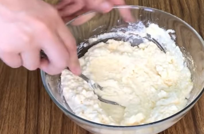 Než se těsto odleží, můžete se vrhnout na přípravu náplně. Do větší mísy vložte tvaroh, zasypejte jej cukrem, přidejte rozklepnuté vajíčko a promíchejte vidličkou.