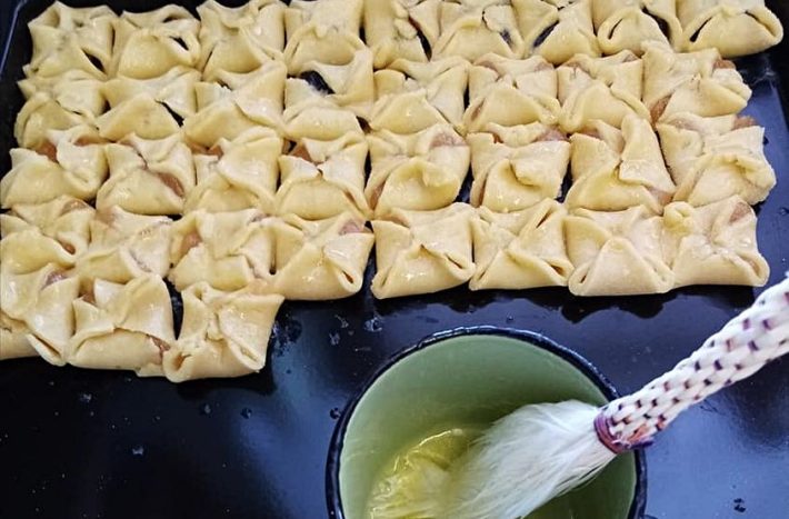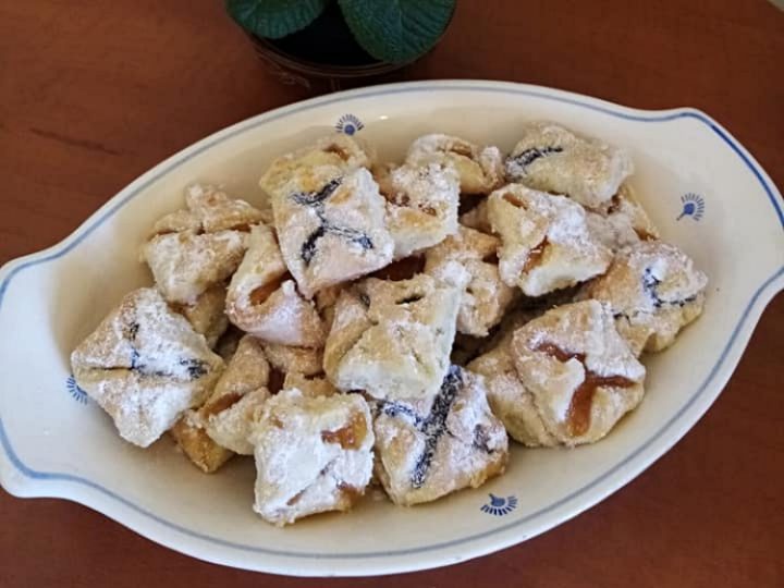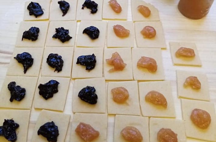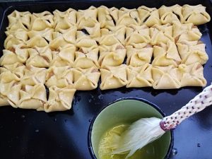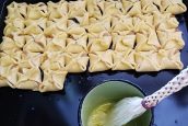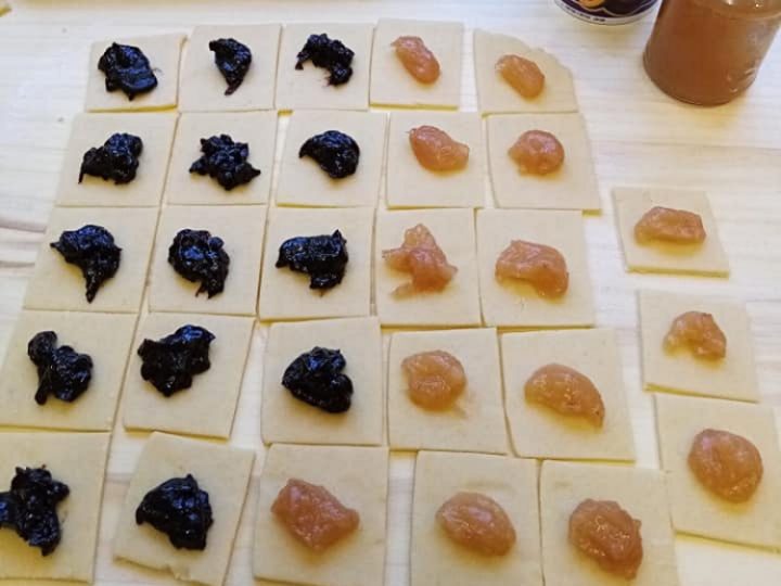 Kvásek smíchejte s moukou, změklým máslem, vaječnými žloutky a špetkou soli a vypracujte hladké a pružné těsto, které nesmí vykynout. Z těsta ihned vyválejte placku silnou asi 3 mm a rozkrájejte ji rádlem na čtverečky. Doprostřed každého z nich položte lžičku náplně a uzavřete ji tak, že spojíte vždy dva protilehlé rohy k sobě, podobně, jako je tomu u šátečků.