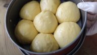 Vykynuté těsto prohněťte, vytvořte z něj váleček a ten rozdělte na 8 stejně velkých kousků, které vložte do formy na pečení.
