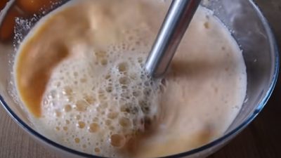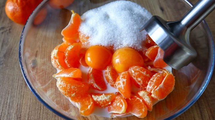 Mandarinky oloupejte, rozdělte na měsíčky a smíchejte je s vejci a mlékem. Přidejte cukr a směs rozmixujte do hladka.