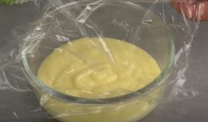 Nejprve si připravte krém. Do hrnce dejte vejce, cukr, vanilkový cukr a kukuřičný škrob a vše rozmíchejte. Poté přilijte čtvrt litru mléka a za stálého míchání vařte, dokud krém nezhoustne. Dejte ho do mísy, přikryjte jeho povrch potravinářskou fólií a nechte vychladnout.