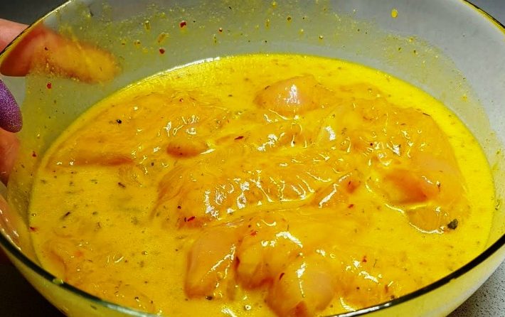 Kuřecí prsa nakrájejte na jednotlivé porce a z obou stran pořádně naklepejte. Všechny kousky masa namočte do marinády a nechte alespoň 2 hodiny odležet. Chcete-li, aby bylo maso ještě měkčí a šťavnatější, nechte ho v ní uležet přes noc v lednici. Díky tomu získáte dokonale dochucené maso, které bude mít nepřekonatelnou chuť.
