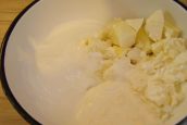 Do hluboké mísy nasypejte mouku a smíchejte ji se sušeným droždím. V mouce si „namočte“ máslo a nastrouhejte ho na hrubém struhadle do mísy. Vařečkou pak směs třete do té doby, dokud nezískáte drobivé těsto.