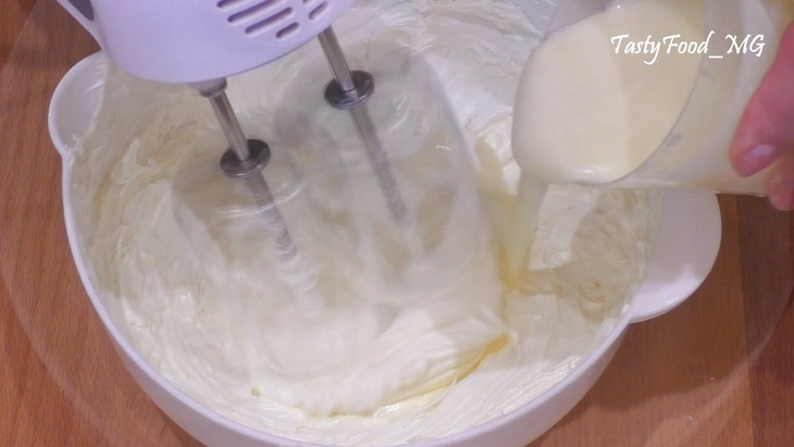 Když máslo proměníte na konzistenci zvící zakysané smetany, začněte do něho přilévat kondenzované mléko. Nepřestávejte přitom hmotu šlehat.