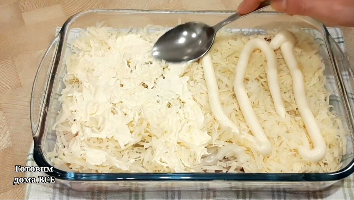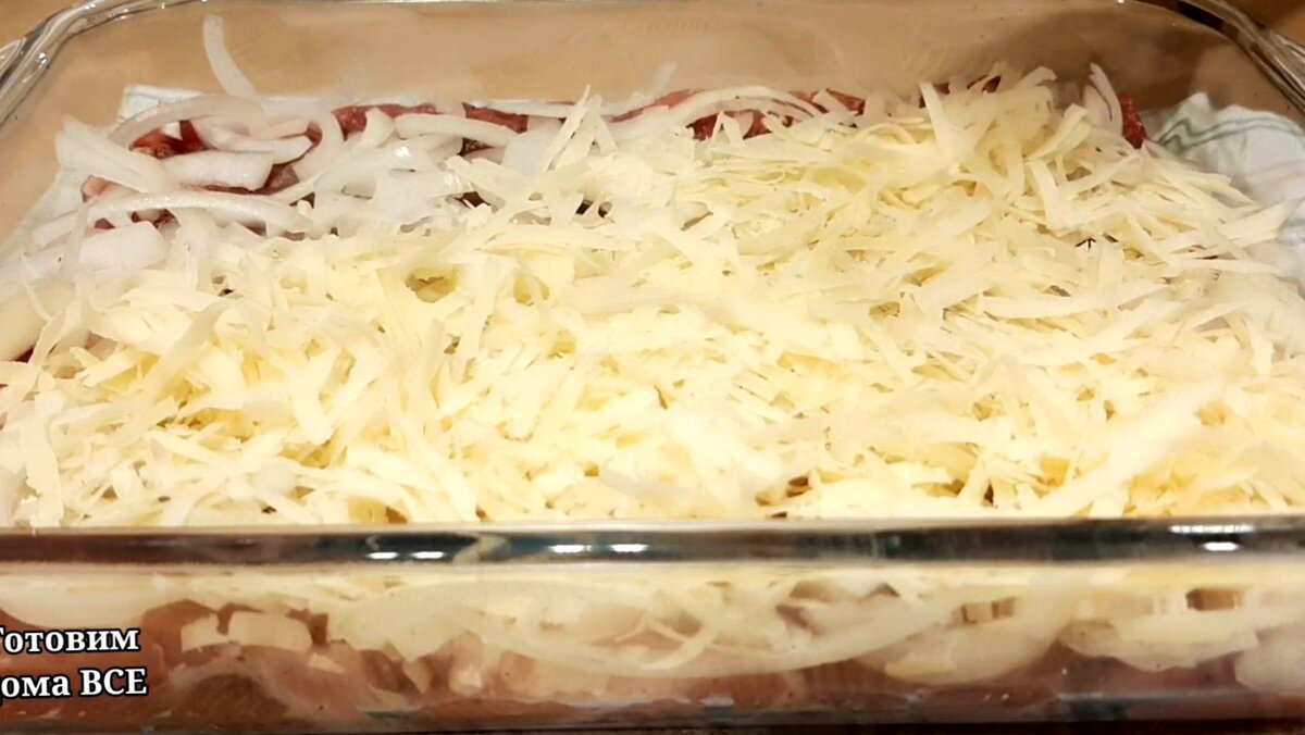 Jednu velkou cibuli nakrájejte na tenké půlkruhy, rozdělte a rozložte na maso. Množství 250 gramů sýra nastrouhejte na hrubém struhadle a rozložte na cibuli.