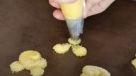 Vzniklým těstem naplňte cukrářský sáček s ozdobnou hlavicí, pomocí kterého vytvořte hromádky ve tvaru medvědích hlav na plechu, pokrytém pečicím papírem.