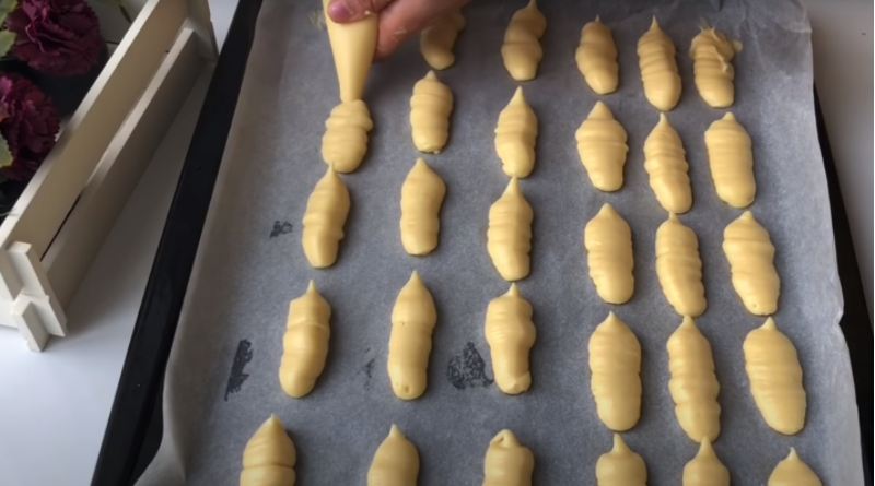 Kompletní odpalované těsto přesuňte do cukrářského sáčku a na plech vystlaný pečícím papírem tvořte jakési „banánky“ o průměru cca 1 až 2 centimetry a délce cca 8 cm.