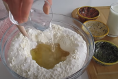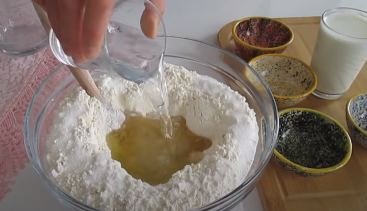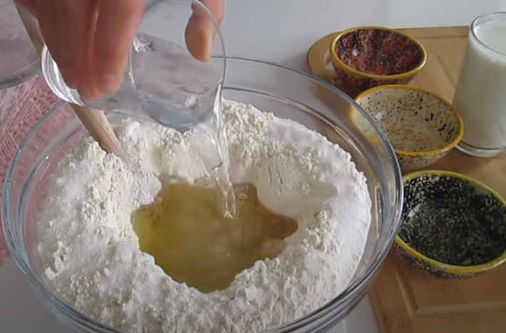 Nejprve si do velké mísy nasypte hladkou mouku. Poté v ní udělejte důlek a do něj vlijte teplou vodu, teplé mléko, olivový olej a také přisypte sůl, krupicový cukr a sušené droždí.