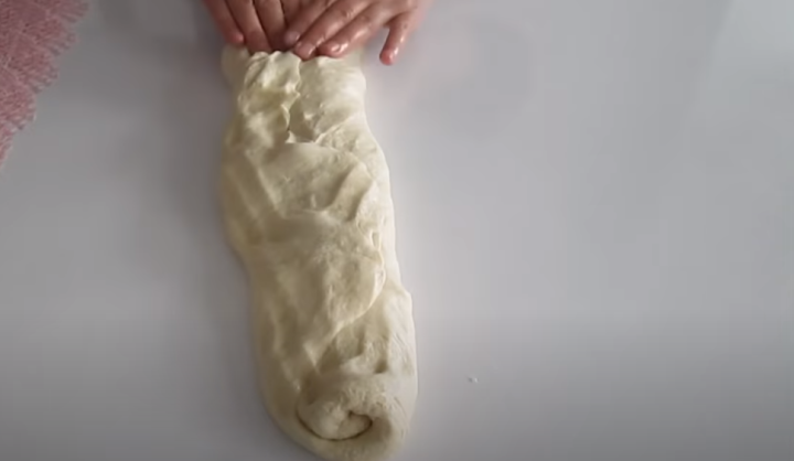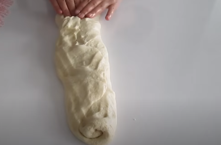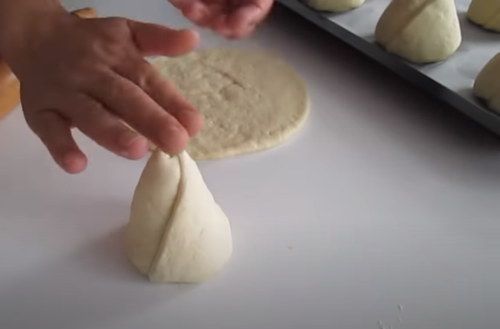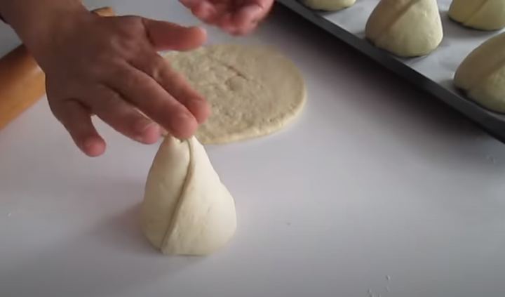 Až těsto vykyne, vyjměte ho na mírně pomoučený vál a ještě několikrát propracujte rukama. Nakonec ho rozdělte na asi devět stejně velkých kousků. Každý z nich pak vyválejte na placku, tu na jedné straně nařízněte nožem a zarolujte kolem dokola.