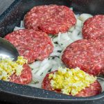 Na vrstvu cibule přijde maso. To je třeba nejprve připravit. Mleté maso, nejlépe hovězí, dejte do mísy a přidejte k němu prolisovaný česnek, sůl a pepř. Vše důkladně promíchejte, aby se všechny složky propojily a maso bylo dokonale ochucené. Následně jednoduše v ruce vytvářejte menší placky, podobné těm na klasické burgery. Dané placky pokládejte jednu vedle druhé na pekáč s připravenou cibulí.