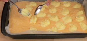 Připravené těsto zamíří na plech. Ideální je hlubší o rozměrech 30 x 25 centimetrů. Ten je třeba vyložit pečicím papírem, aby se eliminovalo připalování moučníku. Poté se do něho nanese hotové těsto. Do něho se pomocí lžíce ledabyle nanese pudink, na různá místa, bez jakéhokoliv systému.