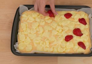 Poslední, co chybí jsou jahody. Ani zde není třeba řešit, kam přesně je položíte. Ideální je rozpůlit je a poté pokládat řezem dolů. Když jahody pokrývají celou plochu, je vše připraveno k pečení. Trouba by měla být rozehřátá na 180 stupňů. Při této teplotě je doba pečení zhruba 30 minut. Poté stačí vyndat z trouby, nechat vystydnout, poté posypat moučkovým cukrem, nakrájet a už lze servírovat.
