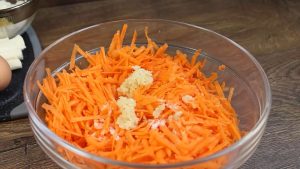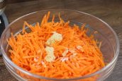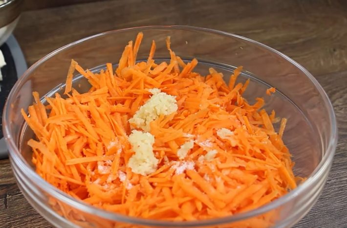 Mrkev nastrouhejte nadrobno a přemístěte ji do větší mísy na salát. Přidejte trochu soli dle chuti. Česnek prolisujte k mrkvi a vše promíchejte.