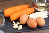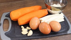 Uvařte tři vejce natvrdo. Mrkev řádně umyjte a oloupejte. Stroužky česneku také oloupejte a všechny ingredience si nachystejte na stůl.