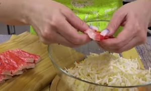 Do mísy dejte korejskou mrkev. Nastrouhejte nahrubo vychladlá uvařená vejce a ztuhlý tavený sýr. Nakonec rozdělte krabí tyčinky na vlákna a přidejte do mísy.