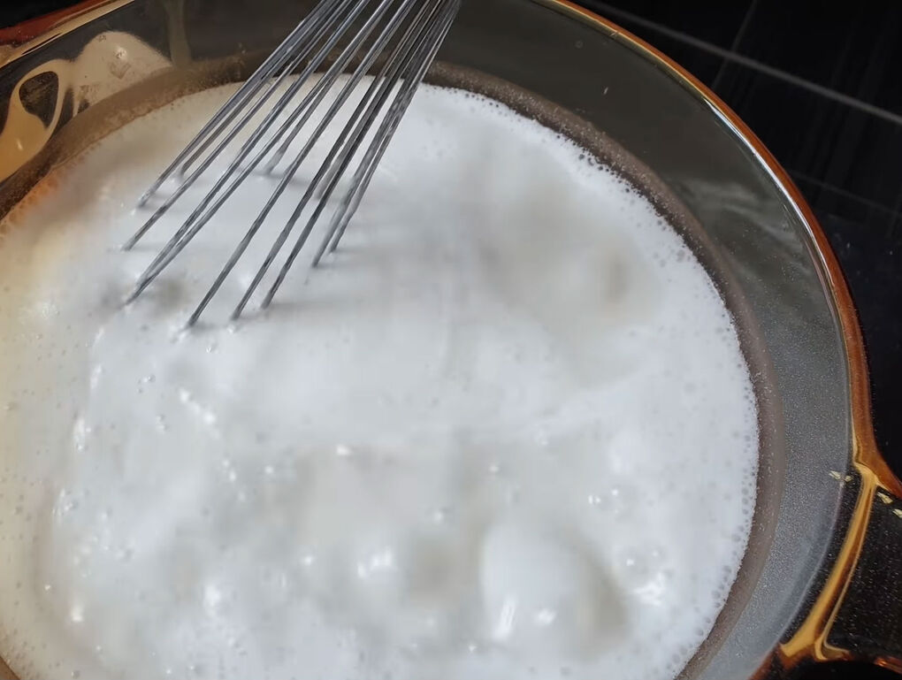 Kokosové mléko nalijte do kastrůlku, zřeďte 1200 mililitry vody a vyšlehejte metličkou. Přidejte 150 gramů moučkového cukr, 5 lžic agaru a 2 lžíce želatinového prášku, rozmíchejte, postavte na kamna a přiveďte k varu. Dobře rozmíchejte, odstavte z kamen a nechte zchladnout.