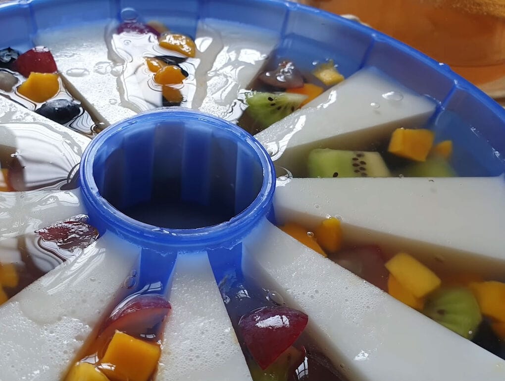 Vyjměte ztuhlé kokosové želé a nakrájejte ho na kousky podle vlnovek formy. Nakrájené želé vložte zpátky do formy tak, aby bylo ob jeden dílek (čímž získáte materiál pro výrobu hned dvou ovocných želatinových dezertů).