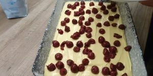 Připravte si plech na pečení, který štědře vytřete máslem a vysypejte moukou. Vlijte do něho těsto a rozprostřete ho do rovnoměrné vrstvy. Vypeckované třešně nebo višně (čerstvé nebo kompotované) vložte do hluboké misky, zaprašte je trochou skořice a cukru a promíchejte. Pak třešně či višně rovnoměrně rozložte po celé ploše těsta v plechu a prsty je mírně zatlačte do těsta.