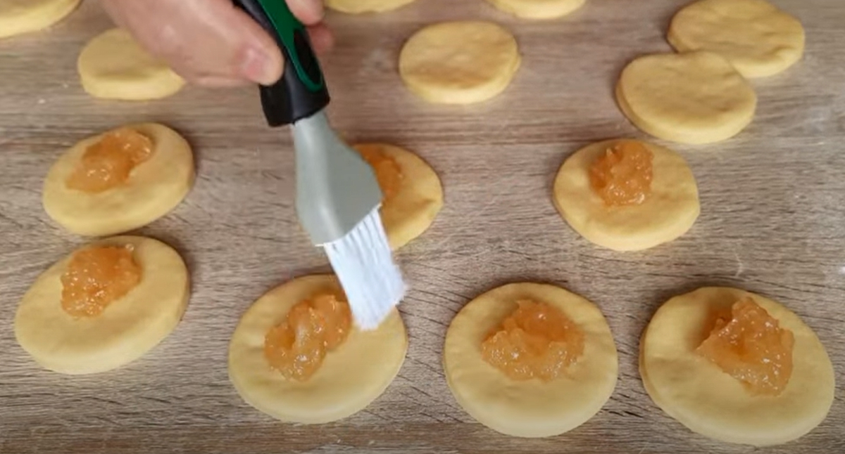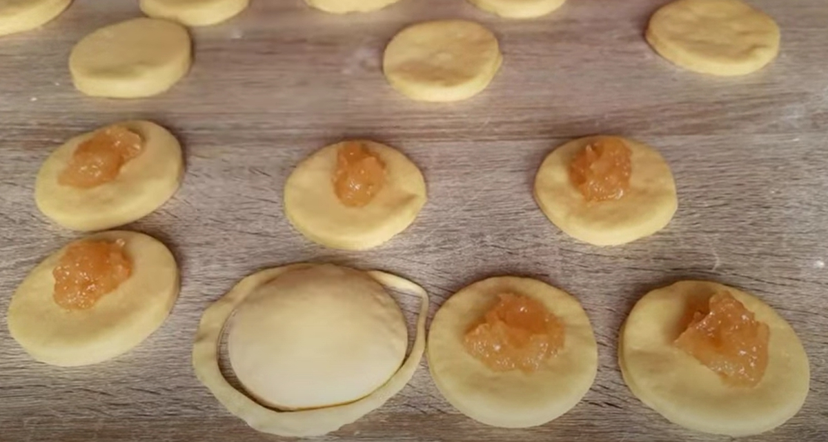 Nyní si k ruce vezměte hrníček a vykrajujte kolečka. Ta by měla mít průměr kolem 8 cm. Dále vložte doprostřed těsta trochu marmelády, přiklopte nenaplněným kolečkem a okraje k sobě přitiskněte.