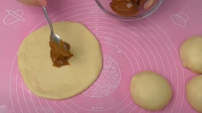 Z každého bochánku vyválejte plát o tloušťce 0,5 cm, do jehož středu vložte lžíci zkaramelizovaného kondenzovaného mléka.