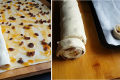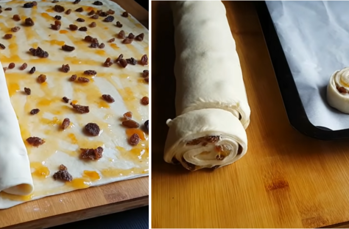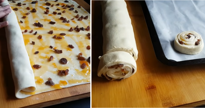 Nechte „koláč“ deset minut v lednici. Poté ho přesuňte na vál a rozválejte válečkem na co nejtenčí plát. Potřete ho marmeládou a posypte rozinkami. Plát těsta srolujte do dlouhé rolády. Vezměte tenkou a pevnou niť, vsuňte ji pod roládu, nahoře překřižte a zatáhněte, abyste z rolády odkrojili asi centimetr tlustý plátek. Jednotlivé šneky rozložte na plech, trochu rozválejte a potřete nejprve trochou rozpuštěného másla, následně žloutkem rozmíchaným s trochou mléka. Pečte asi 20–25 minut na 170 °C.
