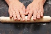 Ve velké míse si vyšlehejte měkký tvaroh spolu s vejci, pak přidejte hladkou mouku, pět lžic krupice, moučkový cukr, kypřící prášek do pečiva, špetku soli a rukama vytvořte hladké, vláčné těsto, které se nebude lepit. To pak přikryjte utěrkou a umístěte na teplé místo. Tam jej nechte po dobu alespoň šedesáti minut. Až hodina uplyne, těsto z mísy vyjměte na vál a vytvořte z něj válec.