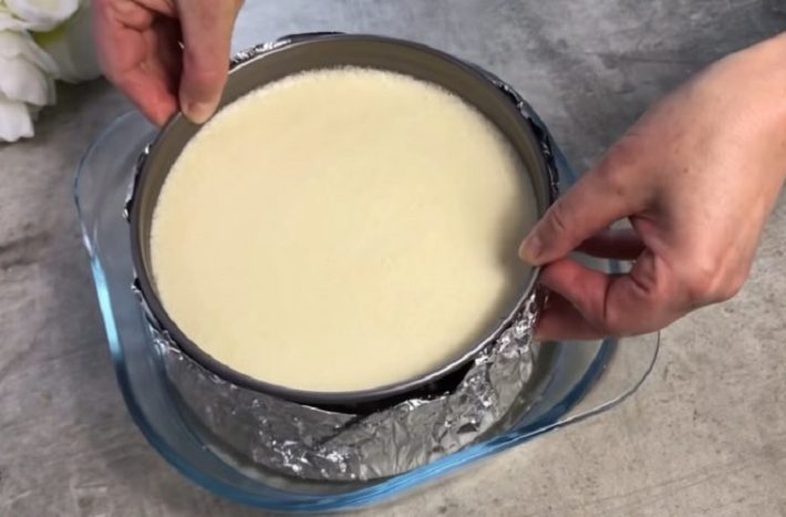 Celou směs poté rovnoměrně nalijte do připravené dortové formy (zhruba o velikosti 20 cm), kterou poté zabalte do alobalu a vložte do větší zapékací mísy či další formy. Do té poté nalijte zhruba půl sklenice čisté vlažné vody a tuto formu vložte do trouby předehřáté na 180 stupňů, v níž pečte těsto cca 45–50 minut.