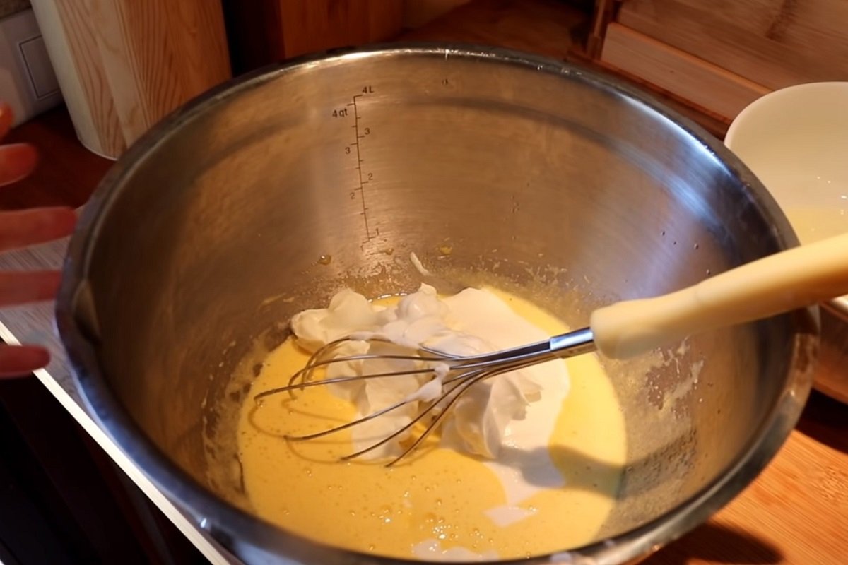 Když je bílkový sníh tuhý, přimíchejte k němu jemně špachtlí směs žloutků s jogurtem a opět zamíchejte do hladka.