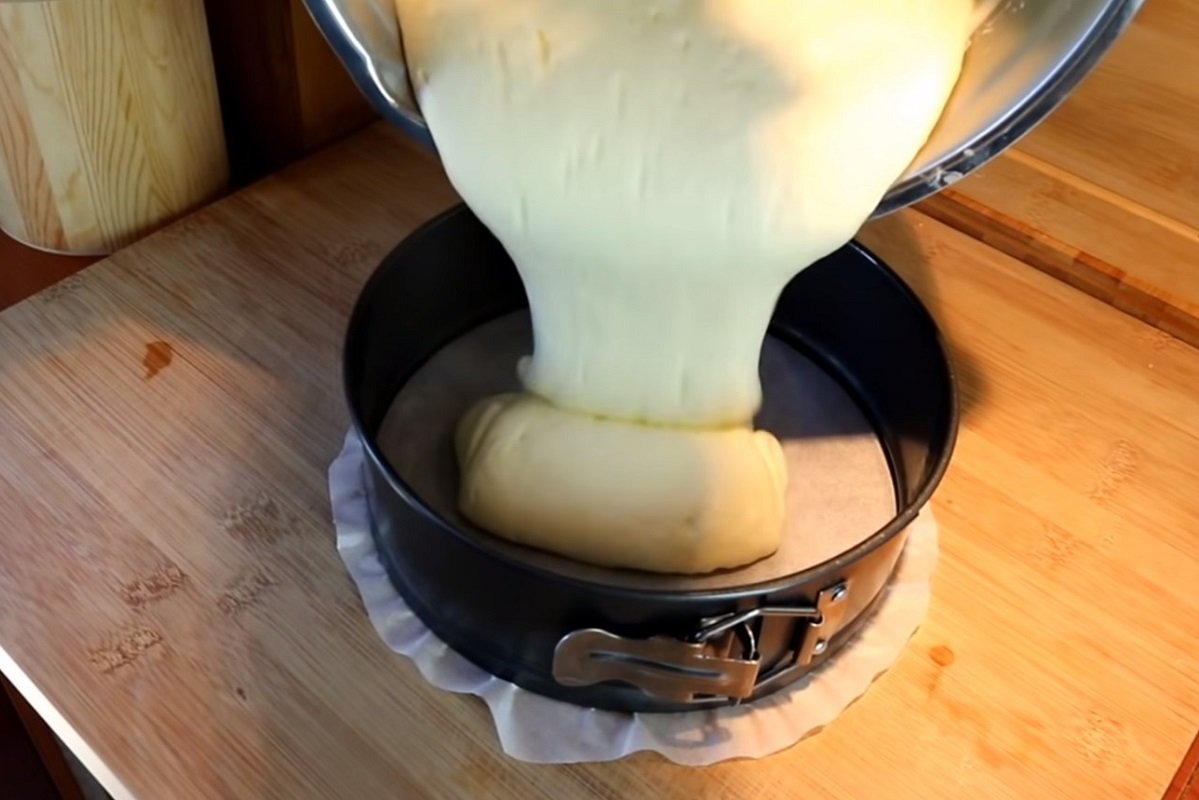 Hotové těsto nalijte do kulaté dortové formy, jejíž dno jste předem vyložili pečicím papírem a stěny pomazali máslem.