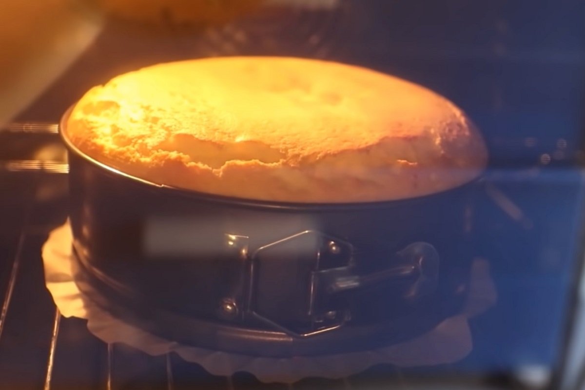 Předehřejte troubu na 170 stupňů Celsia a dejte péct koláč po dobu 45 minut. Po dopečení nechte dort dojít ve vypnuté troubě, pak ho vyndejte a nechte zvolna zchladnout na pokojovou teplotu.