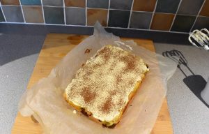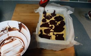 Když získáte jednolité těsto, vlijte asi něco málo přes polovinu těsta do připraveného plechu nebo pekáčku. Zbylé těsto pak smíchejte s kakaovým práškem, důkladně rozmíchejte, abyste získali tmavě hnědou hmotu a tu cik cak nalijte ve flecích na bílé těsto v plechu.