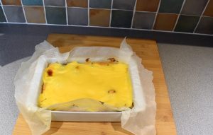 Do hrnce nalijte dvě třetiny odměřeného mléka a přiveďte ho na mírném ohni k varu. Zbylé množství mléka smíchejte s pudinkovým práškem a cukrem a tuto směs důkladně rozmíchejte tak, aby v ní nezůstaly žádné hrudky. Když mléko v hrnci začne bublat, přilijte k němu rozmíchaný pudink s cukrem a za stálého míchání vařte směs až do zhoustnutí. Pudink pak nalijte na těsto v plechu a vložte koláč do předehřáté trouby péct asi 25 až 30 minut (propečení zkontrolujte zapíchnutým párátkem. Pokud je suché, je dopečeno, pokud je mokré a ulpívají na něm kousky těsta, ještě chvilku dopečte).