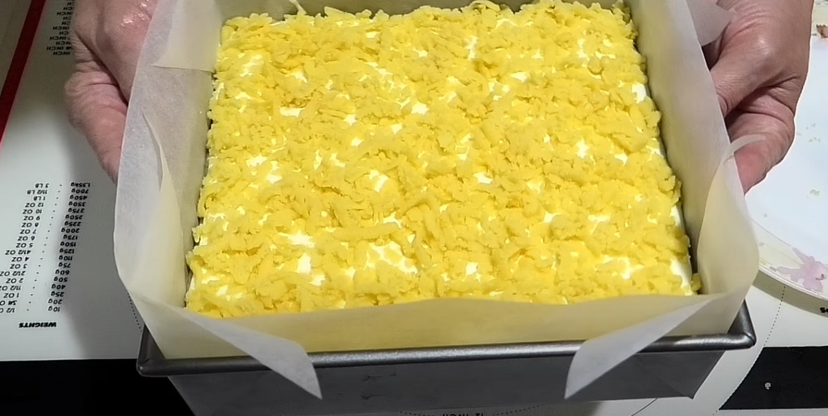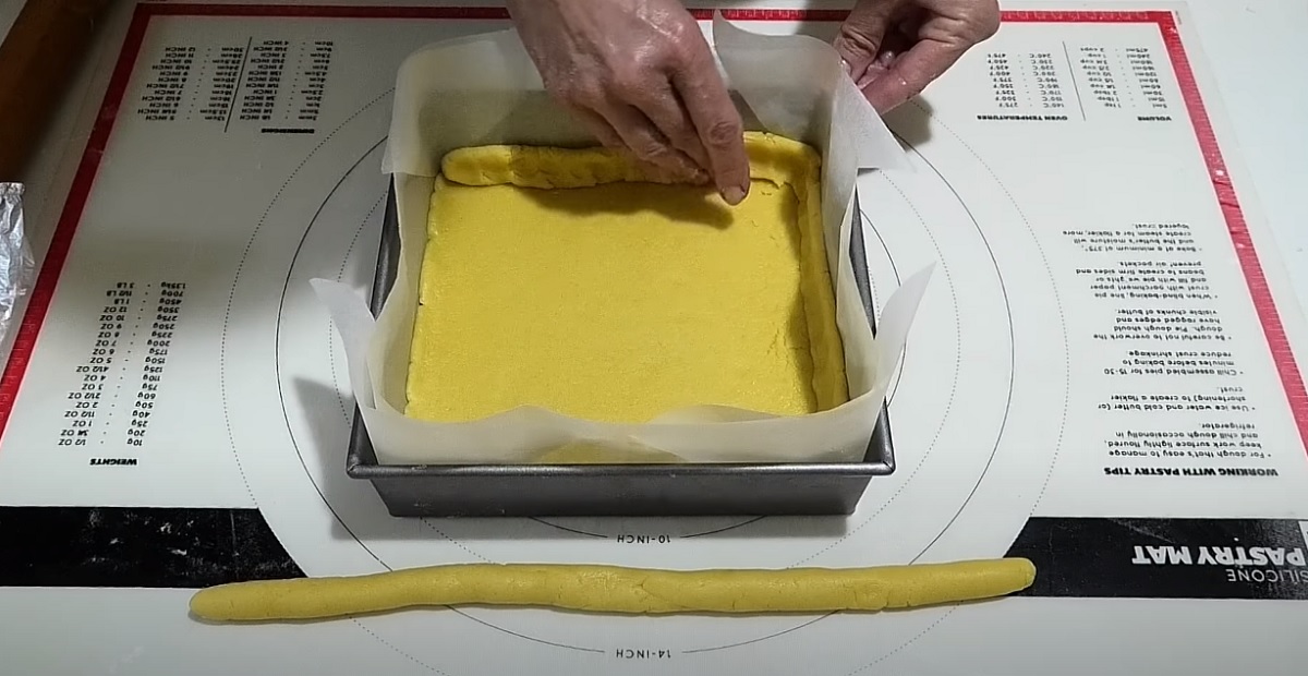 Poté už můžete pudinkový krém nanášet přímo na těsto do zapékací mísy. Rovnoměrně ho rozetřete po krajích. Pokud vám zbylo trochu těsta, můžete ho použít na posypání, kdy ho nastrouháte.