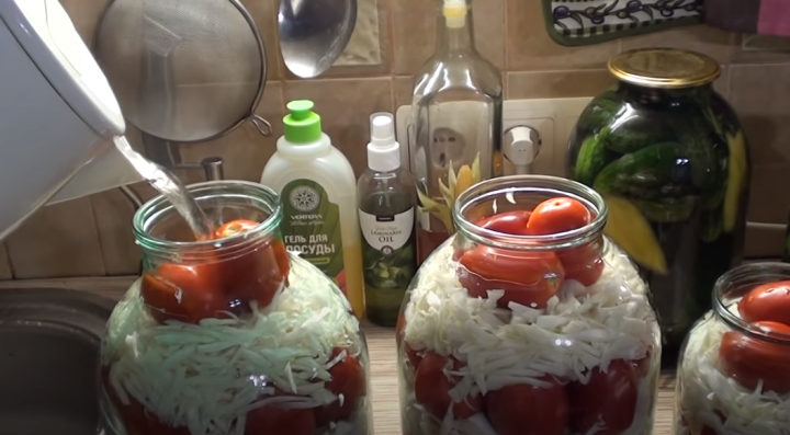 V konvici uvařte vodu a zalijte s ní celý obsah sklenic, které zlehka zavíčkujte a nechte asi 20 minut stát. Poté sklenice otevřete a vodu z nich slijte do hrnce. Podle objemu vody přidejte příslušné množství kyseliny octové, cukru a soli, přidejte bobkové listy, kuličky nového koření a černého pepře a vařte asi 15 minut.