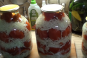 Na bylinky rozložte silnou vrstvu zelí, na to položte všechnu papriku a pak znovu tenčí proužek zelí. Na zelí přidejte trochu česneku a vyskládejte první vrstvu rajčat. Od této chvíle střídejte vrstvu zelí, česneku a rajčat, dokud vám nedojdou suroviny.
