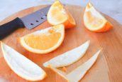 Z pomerančové kůry opatrně škrabkou na brambory nebo jiným způsobem odřízněte bílou vrstvu, která je velmi hořká. Tuto část můžete bez obav vyhodit.