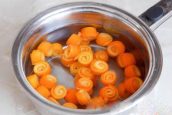 Pomerančové korálky vložte do kastrůlku a zalije je vodou. Postavte kastrůlek na kamna, přiveďte k varu a vařte asi 20 minut. Horkou vodu poté slijte, vyměňte ji znovu za studenou. Postup opakujte celkem čtyřikrát.