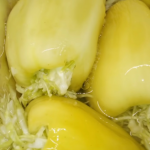 Pokud jde o papriky, můžete použít jakýkoliv druh, který máte k dispozici, bez ohledu na barvu. Pro větší barevnou a chuťovou pestrost můžete samozřejmě zkombinovat i více druhů paprik. Paprikám odřízněte vršek se stopkou, vydlabejte je, omyjte a rozložte otvorem dolů na bavlněnou látku, aby se zbavily co nejvíce vody.