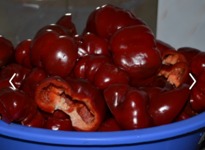 Červené papriky umyjte a osušte. Rozkrájejte je na poloviny a vyjměte z nich stopky a jadřince, stejně jako měkké části se zbytky semínek. Poté čistou dužninu rozkrájejte na plátky o síle kolem 1 až 2 centimetrů.