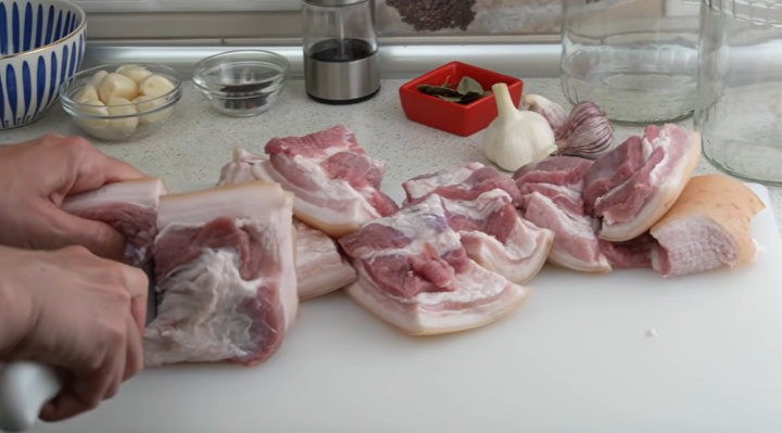 Dvě velké zavařovací sklenice o objemu 1,5 l dokonale vymyjte, vydezinfikujte horkou vodou a dobře osušte. Nyní si připravte maso, které by mělo být z důvěryhodných zdrojů. Není vhodné používat maso, které není veterinárně kontrolované nebo pochází z domácích zdrojů. Maso omyjte a osušte. Nožem jej nakrájejte na velké kusy a dejte jej stranou.