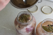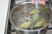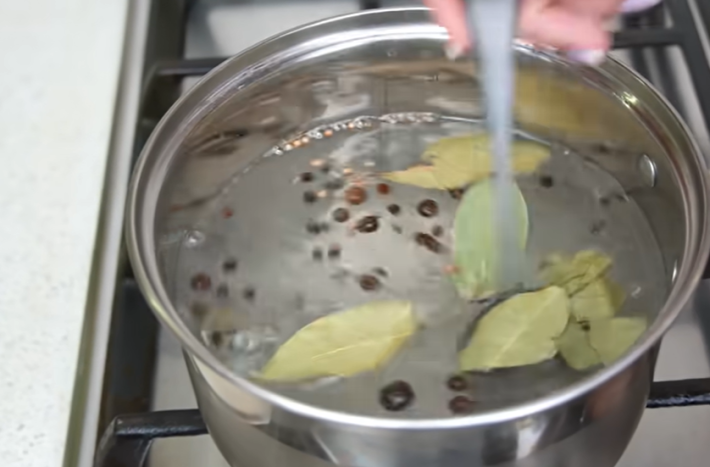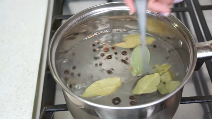 Nyní si připravte nálev. Do hrnce nalijte 1 litr vody a přiveďte ji k varu. Nasypejte požadované množství soli, voda by se měla provzdušnit. Přidejte divoké koření, pepř, nové koření a bobkový list a koriandr. Hrnec přikryjte pokličkou a nechte provařit po dobu 3–4 minut.