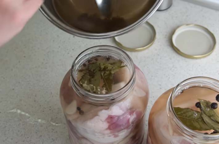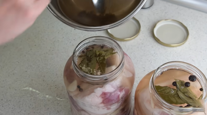 Mezitím si oloupejte stroužky česneku a nakrájejte je na tenké plátky. Vložte maso do připravených zavařovacích sklenic a prokládejte jej nakrájenými plátky česneku. Necpěte jej do sklenic příliš napevno, musí zbýt ještě prostor pro nálev. Po naplnění zalijte horkou solankou z hrnce a vložte do sklenic i koření z nálevu. Sklenice pevně uzavřete, nechte vychladnout při pokojové teplotě a vložte do chladničky na 5 dní.