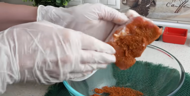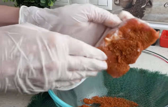 Po uplynutí doby vyndejte sklenice z chladničky, maso vyjměte z nálevu a osušte pomocí papírových utěrek. V misce smíchejte koření na obalení masa, dobře zamíchejte a jednotlivé kusy masa ze všech stran pořádně kořením obalte. Používejte při práci gumové rukavice. Poté jednotlivé kusy zabalte do pergamenového papíru a uložte do mrazničky. Po 24 hodinách můžete konzumovat, stačí nakrájet na tenké plátky a podávat s čerstvým chlebem a zeleninovou oblohou. Maso se skladuje v mrazničce a konzumuje dle potřeby.