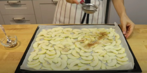 Oloupejte jablka, rozkrojte je na čtvrtiny a odstraňte všechny části jadřinců. Dužninu pak rozkrájejte na tenké plátky tvaru půlměsíce. Vložte pokrájená jablka do hluboké misky, pokapejte je dvěma lžícemi citrónové šťávy a vše dobře promíchejte. Díky tomu plátky jablek neztmavnou a uchovají si svou čerstvou barvu. Připravte si plech vyložený pečicím papírem a vyskládejte na celý jeho povrch plátky jablek těsně vedle sebe. Přitom dbejte na to, aby se nikde nepřekrývaly. Zasypejte je skořicí a nechte chvíli stát.