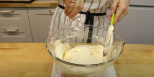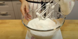 Vyklepněte pět vajíček a oddělte od sebe bílky od žloutků a každé vložte do zvláštní misky. Do misky k bílkům přihoďte špetku soli a elektrickým šlehačem šlehejte, dokud nezískáte měkkou pěnu. K té pak postupně přidávejte cukr, aniž byste přestávali šlehat. Pokračujte v práci, dokud nezískáte pevnou pěnu, která sama drží v misce a po vytažení metliček zanechává pevné špičky.