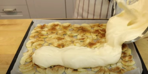 Když těsto získá homogenní kašovitou konzistenci, vlijte ho na jablka v plechu a důkladně jej rozetřete po celém povrchu. Vložte plech s těstem do trouby předehřáté na 180 °C po dobu 20 až 25 minut dozlatova.