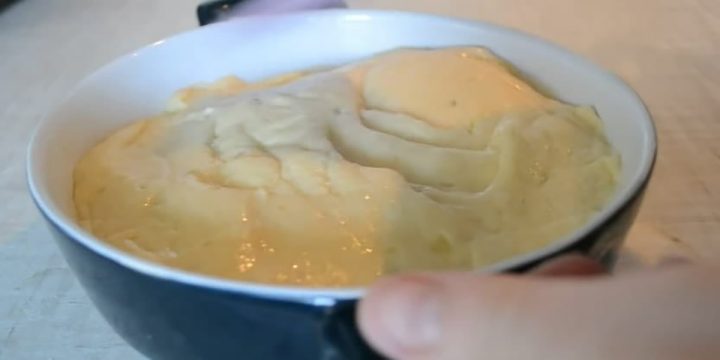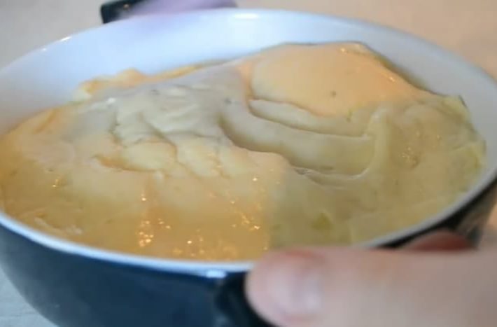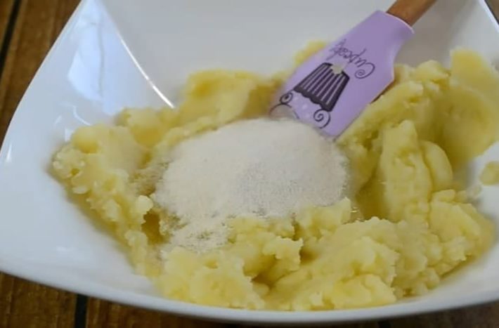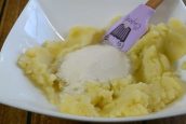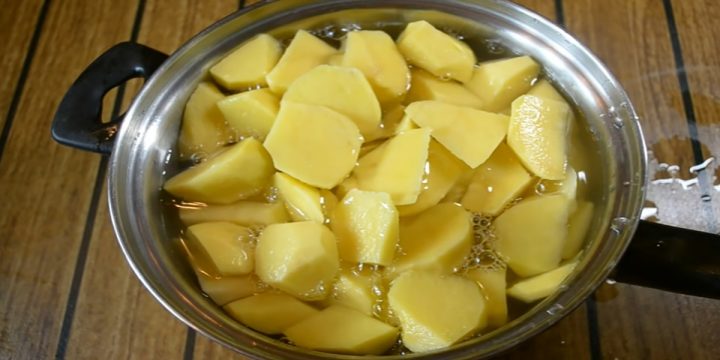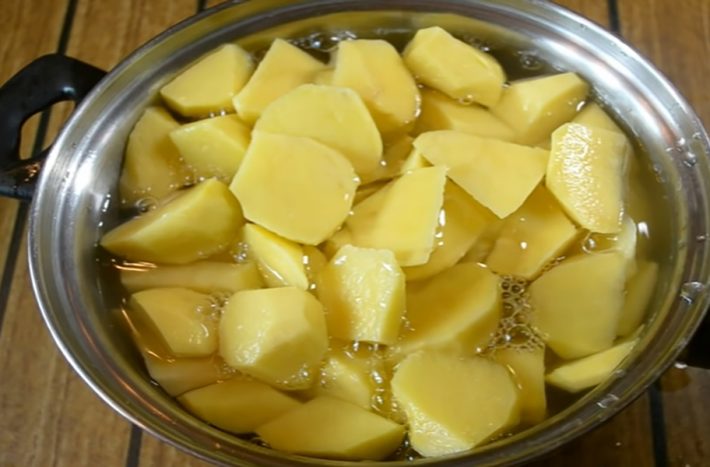 Brambory oškrábejte, nakrájejte na malé kousky a vložte do hrnce s vodou. Nemusíte přidávat velké množství vody. Stačí, když budou brambory ponořené. Aby se rychleji uvařily, můžete přidat malé množství olivového oleje, který jim také dodá zajímavou chuť. Vařte, dokud nebudou hotové. Brambory sceďte, přendejte do mísy a rozmačkejte šťouchadlem na brambory.