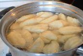 Do bramborové směsi prosejte mouku a důkladně promíchejte. Vzniklé bramborové těsto přendejte do nižší nádoby a rovnoměrně ho rozetřete stěrkou namočenou v oleji. Připravte si hrnec s vodou a špetkou soli. Přiveďte ji v k varu.