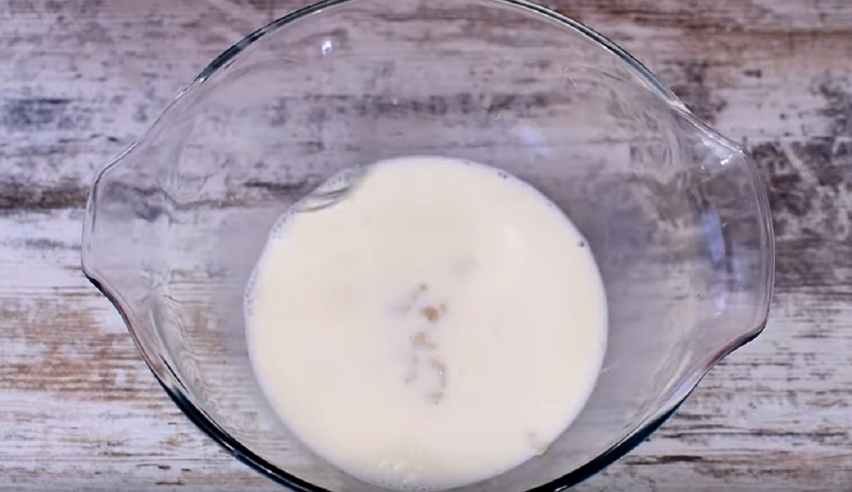 Do mísy nalijte teplé mléko, přidejte cukr a rozdrobte do směsi droždí. Metličkou či vidličkou dobře prošlehejte, aby se cukr a droždí rozpustily a nechte směs stát 15 minut, dokud se na jejím povrchu nezačne tvořit pěna. To značí, že jsou kvasinky v droždí probuzené k životu a připravené vykonávat svoji práci.